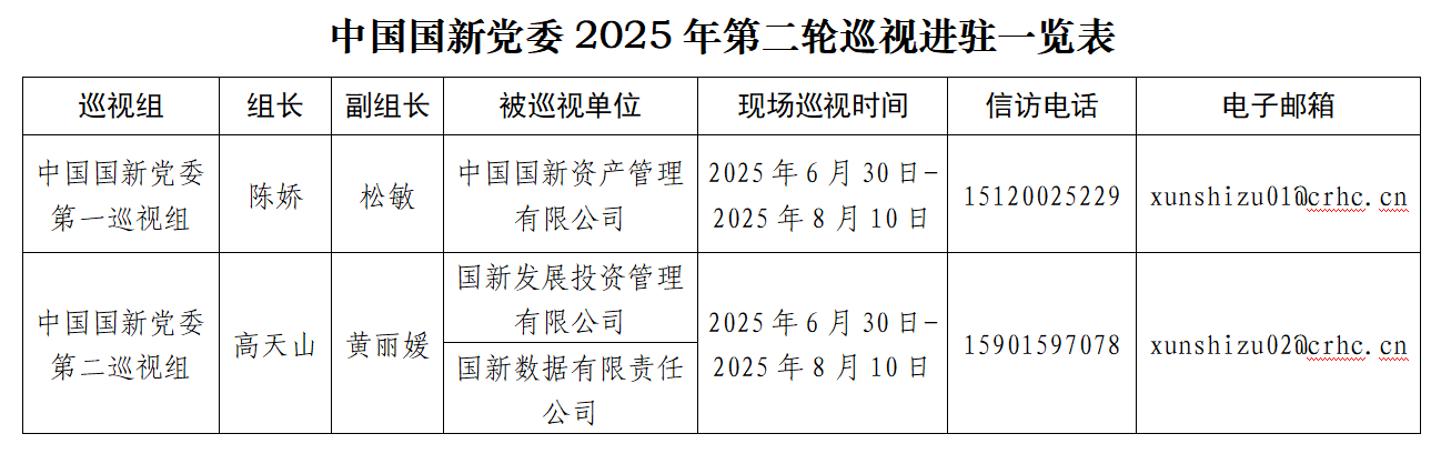 按照中國(guó)國(guó)新黨委和巡視工作領(lǐng)導(dǎo)小組部署安排,截至6月30日,中國(guó)國(guó)新黨委第二輪巡視完成進(jìn)駐工作。中國(guó)國(guó)新黨委2個(gè)巡視組將對(duì)中國(guó)國(guó)新資產(chǎn)管理有限公司、國(guó)新發(fā)展投資管理有限公司、國(guó)新數(shù)據(jù)有限責(zé)任公司等3家企業(yè)黨組織開展常規(guī)巡視。