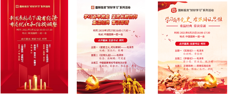 國(guó)新投資在開(kāi)展黨史學(xué)習(xí)教育中,做到規(guī)定動(dòng)作與自選動(dòng)作緊密結(jié)合,突出黨史學(xué)習(xí)教育與承擔(dān)的國(guó)有資本股權(quán)運(yùn)作使命充分融合,突出年輕黨員作用,以青年理論學(xué)習(xí)小組和黨建創(chuàng)新小組作為黨史學(xué)習(xí)教育的策劃者和執(zhí)行者,打造“好好學(xué)習(xí)”、“天天向上”、“拾星”讀書(shū)會(huì)三大黨建創(chuàng)新活動(dòng)平臺(tái),調(diào)動(dòng)青年骨干、激發(fā)學(xué)史熱忱,讓年輕人愿意學(xué),主動(dòng)悟,自愿做。