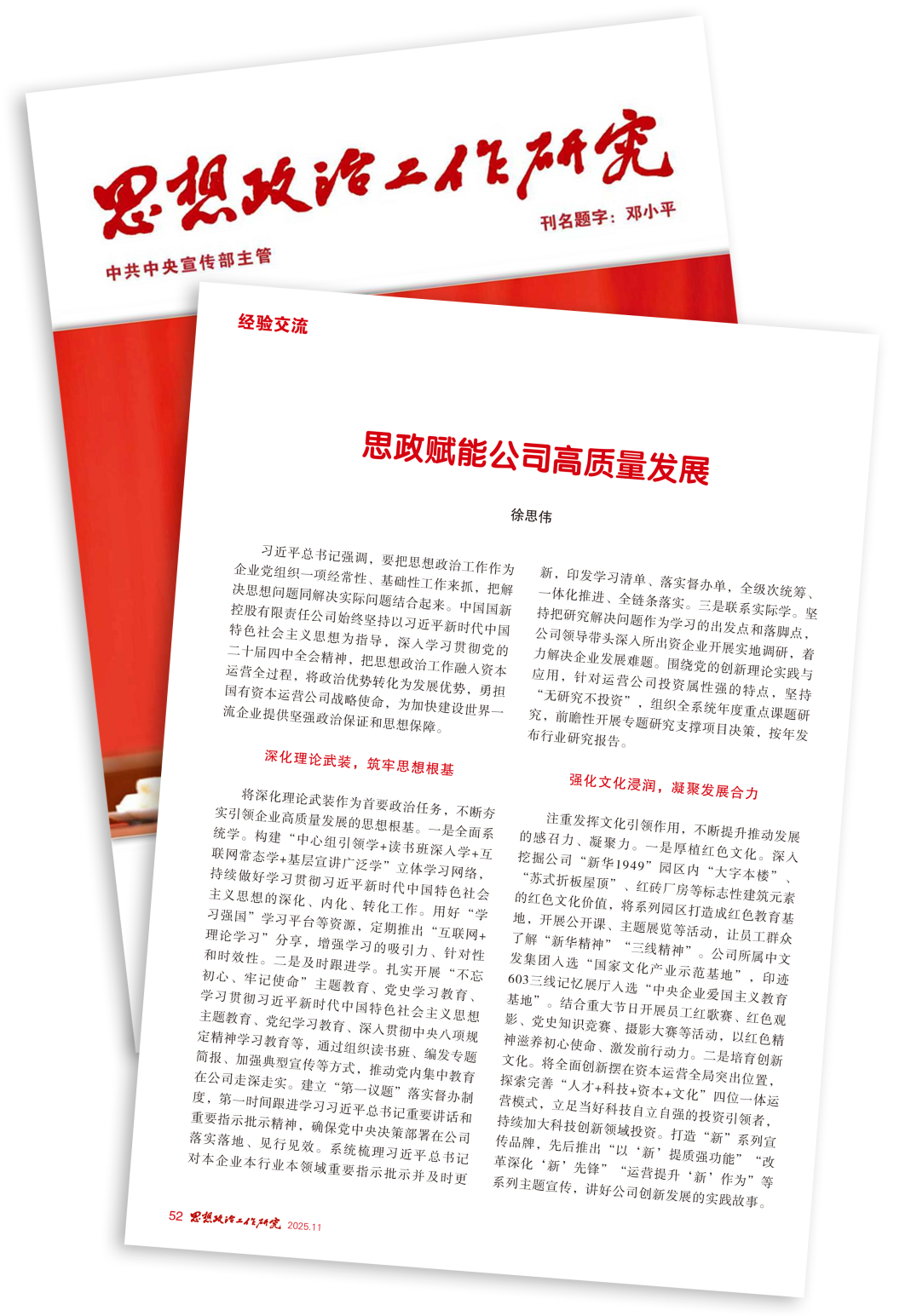 《思想政治工作研究》2025年第11期刊發(fā)中國國新黨委書記、董事長徐思偉署名文章《思政賦能公司高質(zhì)量發(fā)展》,報(bào)道中國國新深入學(xué)習(xí)貫徹黨的二十屆四中全會(huì)精神,把思想政治工作融入資本運(yùn)營全過程,將政治優(yōu)勢轉(zhuǎn)化為發(fā)展優(yōu)勢,勇?lián)鷩匈Y本運(yùn)營公司戰(zhàn)略使命。現(xiàn)將全文分享如下: