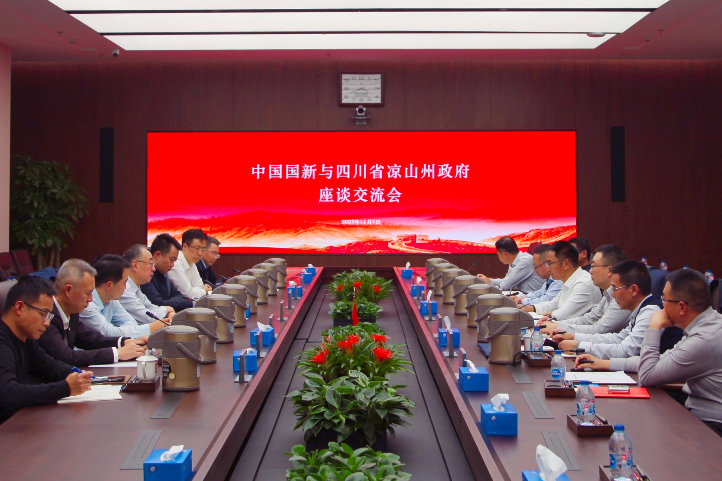 11月7日,中國(guó)國(guó)新黨委委員、總會(huì)計(jì)師劉學(xué)詩(shī)在公司總部會(huì)見四川省涼山州委副書記、州長(zhǎng)張文旺,涼山州副州長(zhǎng)李強(qiáng)參加會(huì)見。