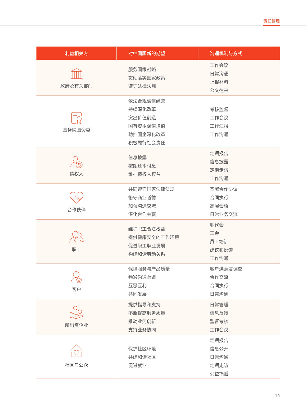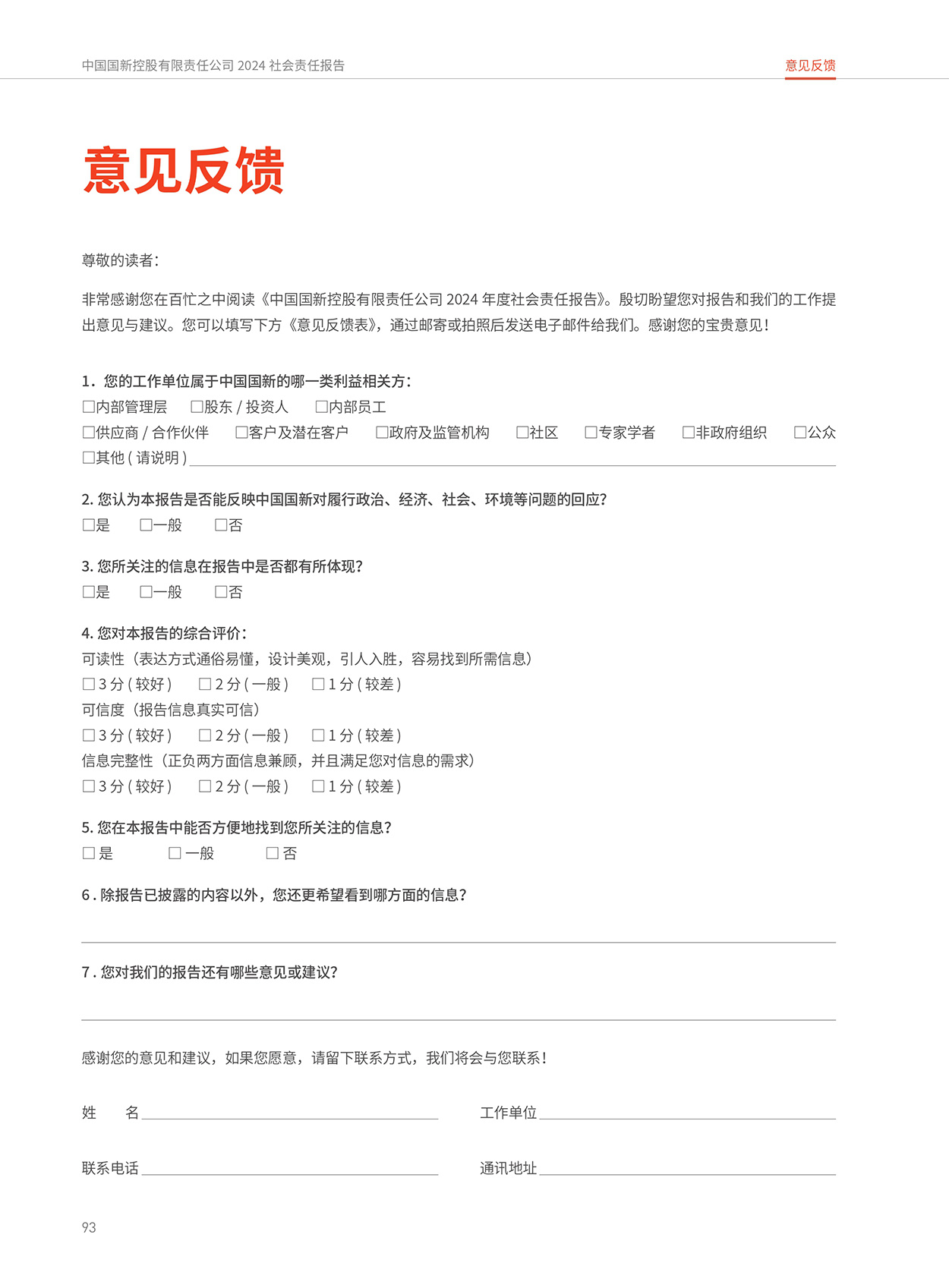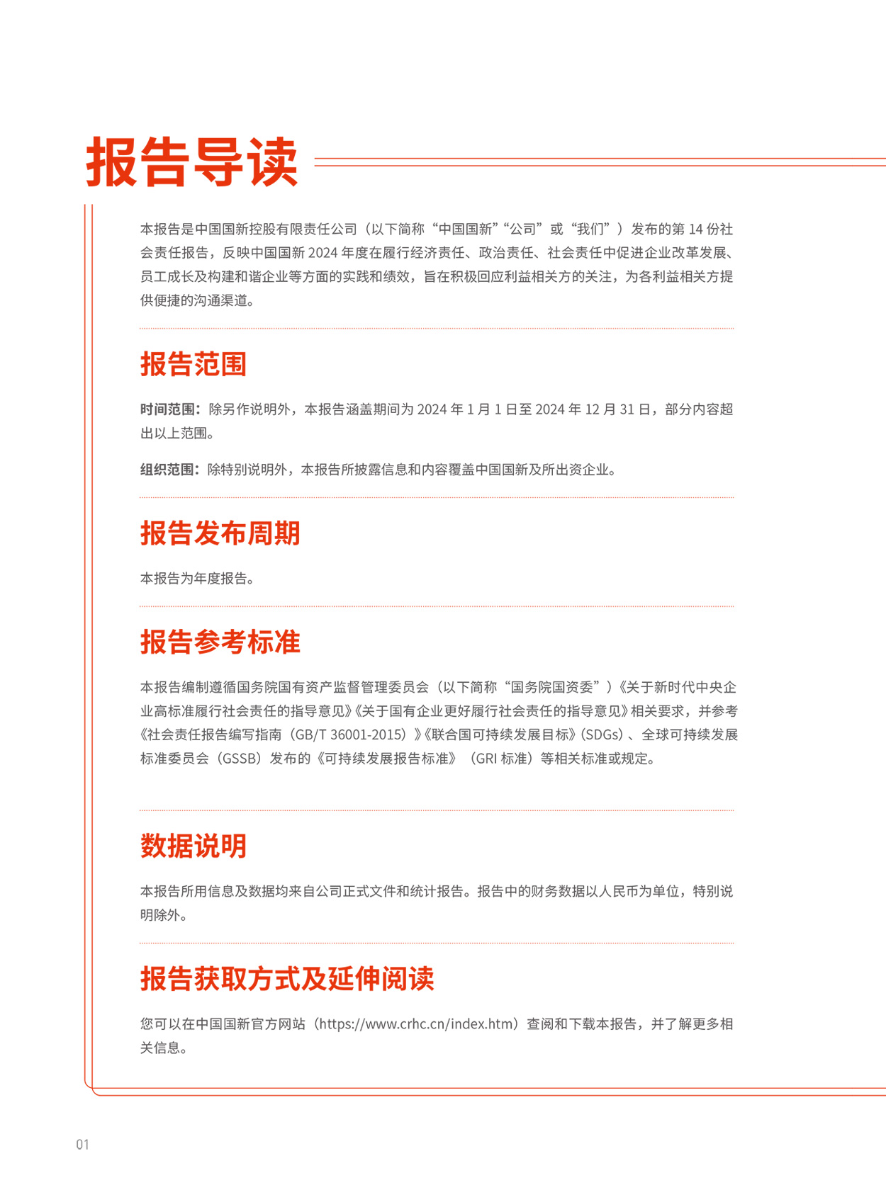 本報(bào)告是中國國新控股有限責(zé)任公司發(fā)布的第14份社會(huì)責(zé)任報(bào)告,反映中國國新2024年度在履行經(jīng)濟(jì)責(zé)任、政治責(zé)任、社會(huì)責(zé)任中促進(jìn)企業(yè)改革發(fā)展、員工成長及構(gòu)建和諧企業(yè)等方面的實(shí)踐和績效,旨在積極回應(yīng)利益相關(guān)方的關(guān)注,為各利益相關(guān)方提供便捷的溝通渠道。