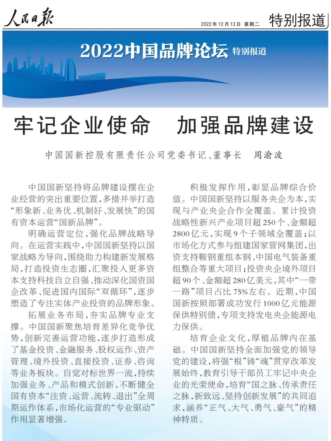 近日,由人民日?qǐng)?bào)社主辦的2022中國(guó)品牌論壇在北京舉行,中國(guó)國(guó)新黨委書(shū)記、董事長(zhǎng)周渝波受邀作主題發(fā)言,詳細(xì)闡述了中國(guó)國(guó)新多措并舉打造“形象新、業(yè)務(wù)優(yōu)、機(jī)制好、發(fā)展快”的國(guó)有資本運(yùn)營(yíng)“國(guó)新品牌”的經(jīng)驗(yàn)做法。12月13日出版的《人民日?qǐng)?bào)》推出《2022中國(guó)品牌論壇》特別報(bào)道,以《牢記企業(yè)使命,加強(qiáng)品牌建設(shè)》為題摘發(fā)了這一主題發(fā)言,現(xiàn)分享如下: