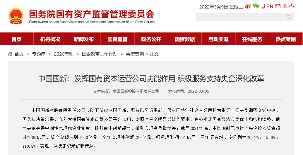 3月9日,國資委網(wǎng)站刊發(fā)中國國新落實國企改革三年行動典型案例文章《中國國新:發(fā)揮國有資本運營公司功能作用 積極服務(wù)支持央企深化改革 》。為您全文分享如下。