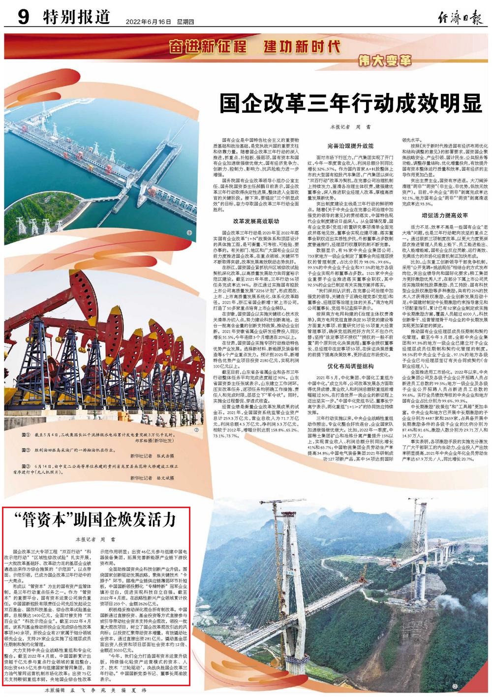 2022年6月16日出刊的《經(jīng)濟(jì)日?qǐng)?bào)》在“奮進(jìn)新征程 建功新時(shí)代·偉大變革”推出特別報(bào)道《國(guó)企改革三年行動(dòng)成效明顯》,深入報(bào)道了國(guó)企改革三年行動(dòng)取得的決定性進(jìn)展和重要成效。報(bào)道同時(shí)配發(fā)《“管資本”助國(guó)企煥發(fā)活力》一文,專門(mén)報(bào)道了中國(guó)國(guó)新如何聚焦改革三年行動(dòng),強(qiáng)化運(yùn)營(yíng)公司功能作用,服務(wù)央企改革發(fā)展。現(xiàn)將全文分享如下: