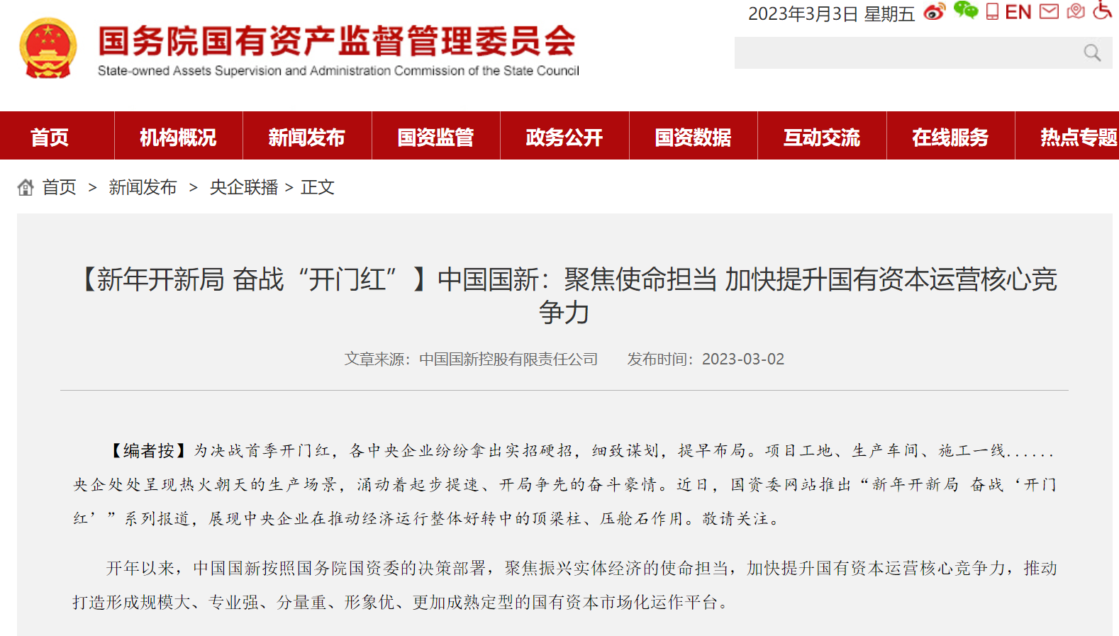 3月2日,國資委官網(wǎng)“新年開新局 奮戰(zhàn)‘開門紅’”專題中發(fā)布《中國國新:聚焦使命擔(dān)當(dāng) 加快提升國有資本運營核心競爭力》一文,從聚焦助力實體經(jīng)濟(jì)、大力支持科技創(chuàng)新、著力提升核心競爭力三個方面,報道中國國新開年以來,以“開局就攻堅、起步即加速”的勁頭,推動打造形成規(guī)模大、專業(yè)強(qiáng)、分量重、形象優(yōu)、更加成熟定型的國有資本市場化運作平臺?,F(xiàn)為您全文分享如下: